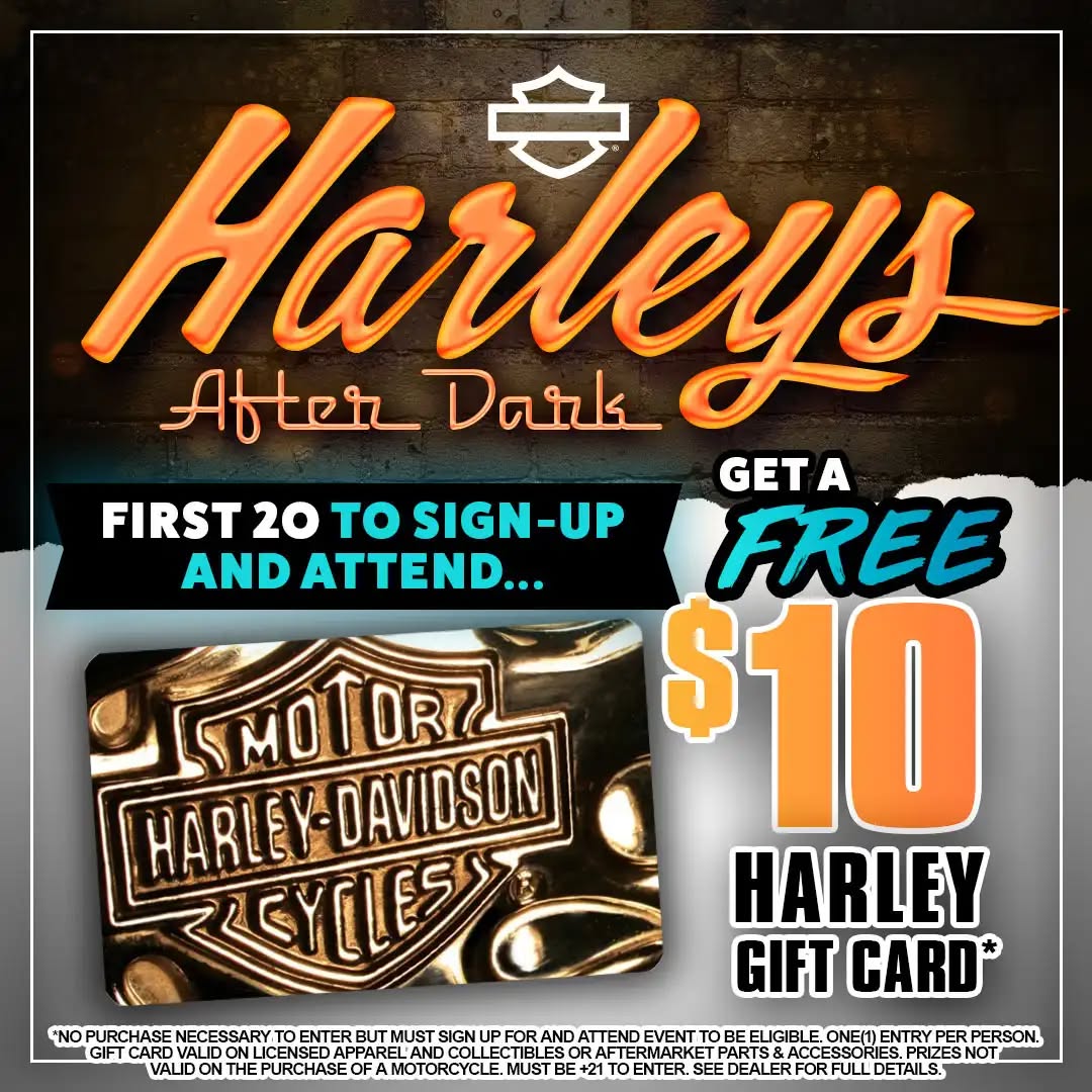 *No purchase necessary to enter but must sign up for and attend event to be eligible. One(1) entry per person. Gift card valid on licensed apparel and collectibles or aftermarket parts & accessories. Prizes not valid on the purchase of a motorcycle. Must be +21 to Enter. See dealer for full details.
